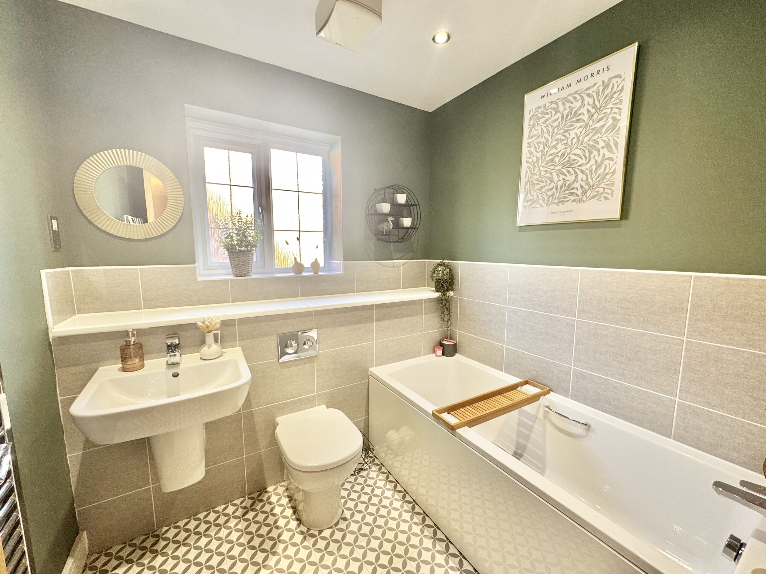 The family bathroom is fitted with a three-piece suite comprising a panel bath, WC, and wash basin, complemented by a chrome heated towel rail and a privacy window to the side elevation.