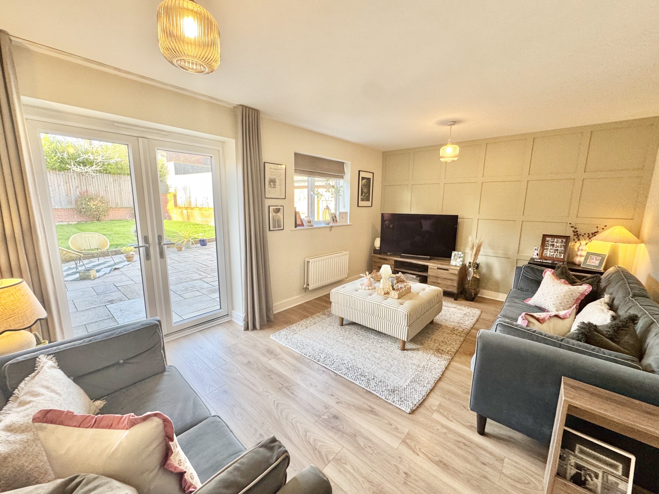 - Bright rear lounge with French doors to the garden and a stunning sage green panelled feature wall.