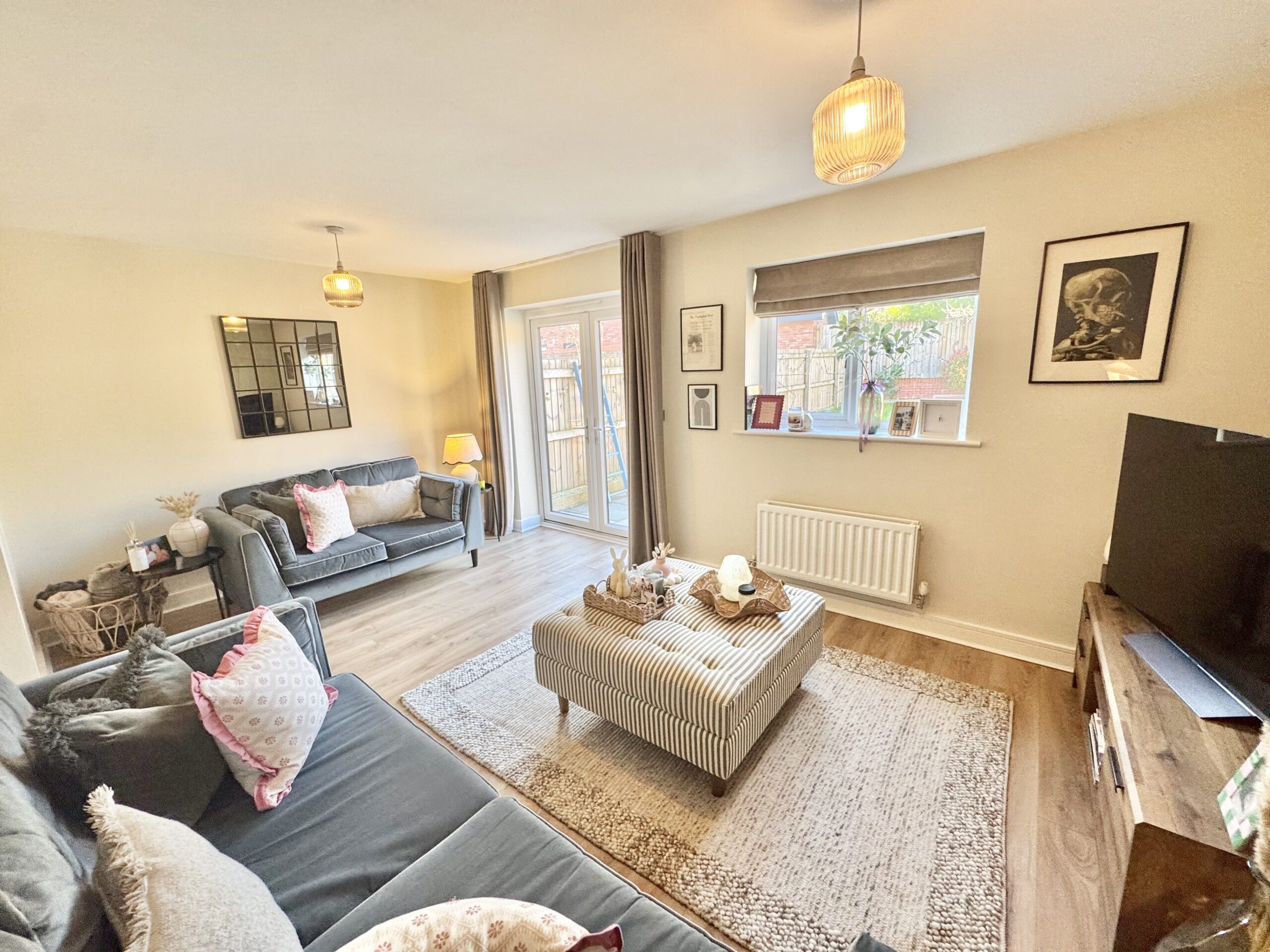 To the rear, the lounge is a relaxing and stylish space featuring warm wood laminate flooring and double glazed French doors alongside a window overlooking the garden, allowing the room to be bathed in natural light. A stunning sage green panelled feature wall creates a beautiful focal point and adds a touch of contemporary charm — the sort of wall that quietly says, “Yes, this house has good taste.”
