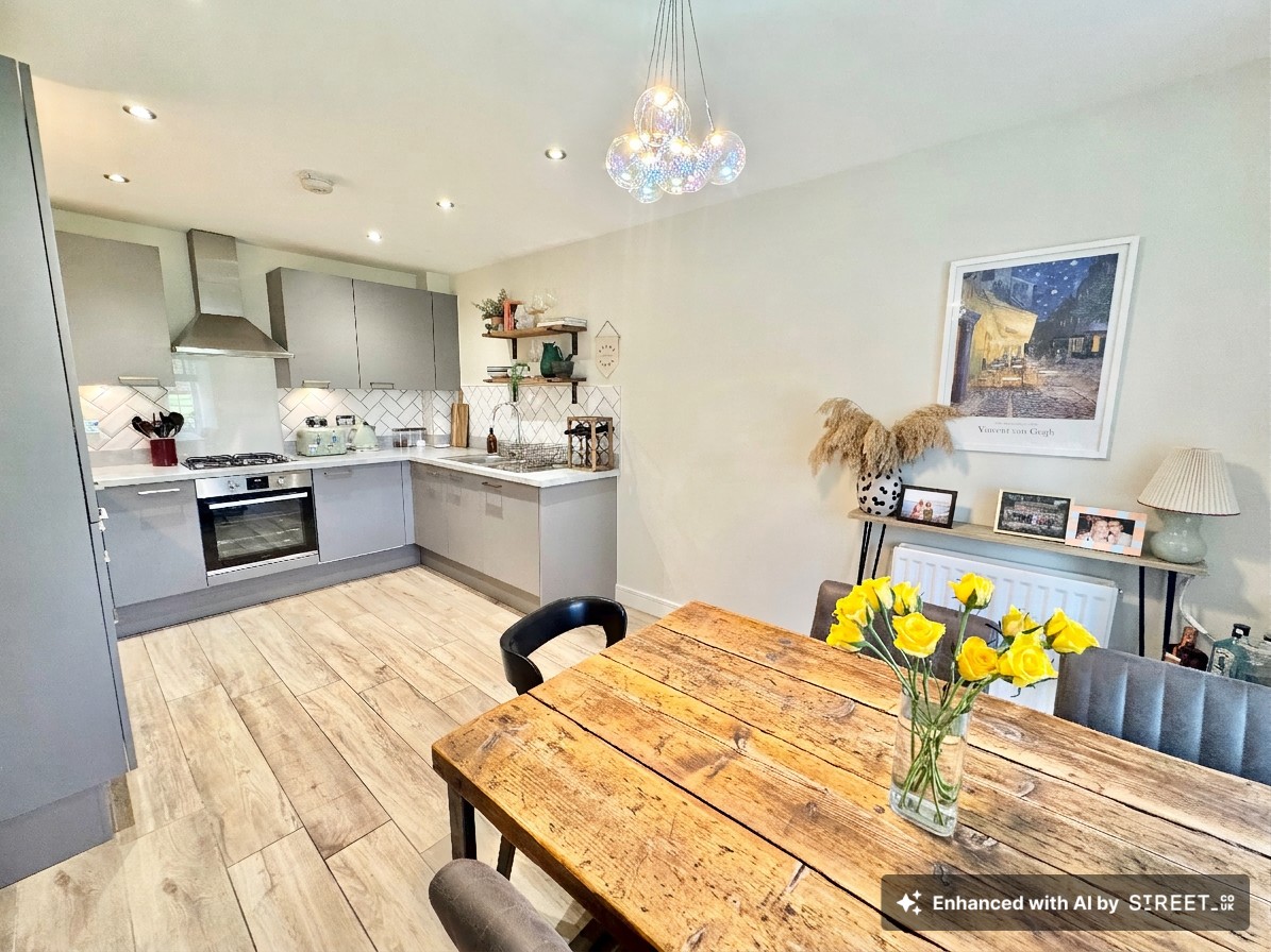 To the front of the home sits the stylish kitchen diner, complete with attractive tiled flooring and a double glazed box window that fills the space with natural light. The kitchen is fitted with a range of modern grey matt base units, drawers, and wall cupboards topped with laminate roll-top work surfaces. A stainless steel one-and-a-half bowl sink with swan neck mixer tap sits beneath the window, while the fitted electric oven with four-ring gas hob and extractor hood above makes cooking a pleasure (or at least makes takeaway look more impressive when plated nicely). An integrated fridge freezer is neatly tucked away, and there’s ample space for a six-seater dining table – perfect for family meals, entertaining friends, or spreading out the Sunday papers.