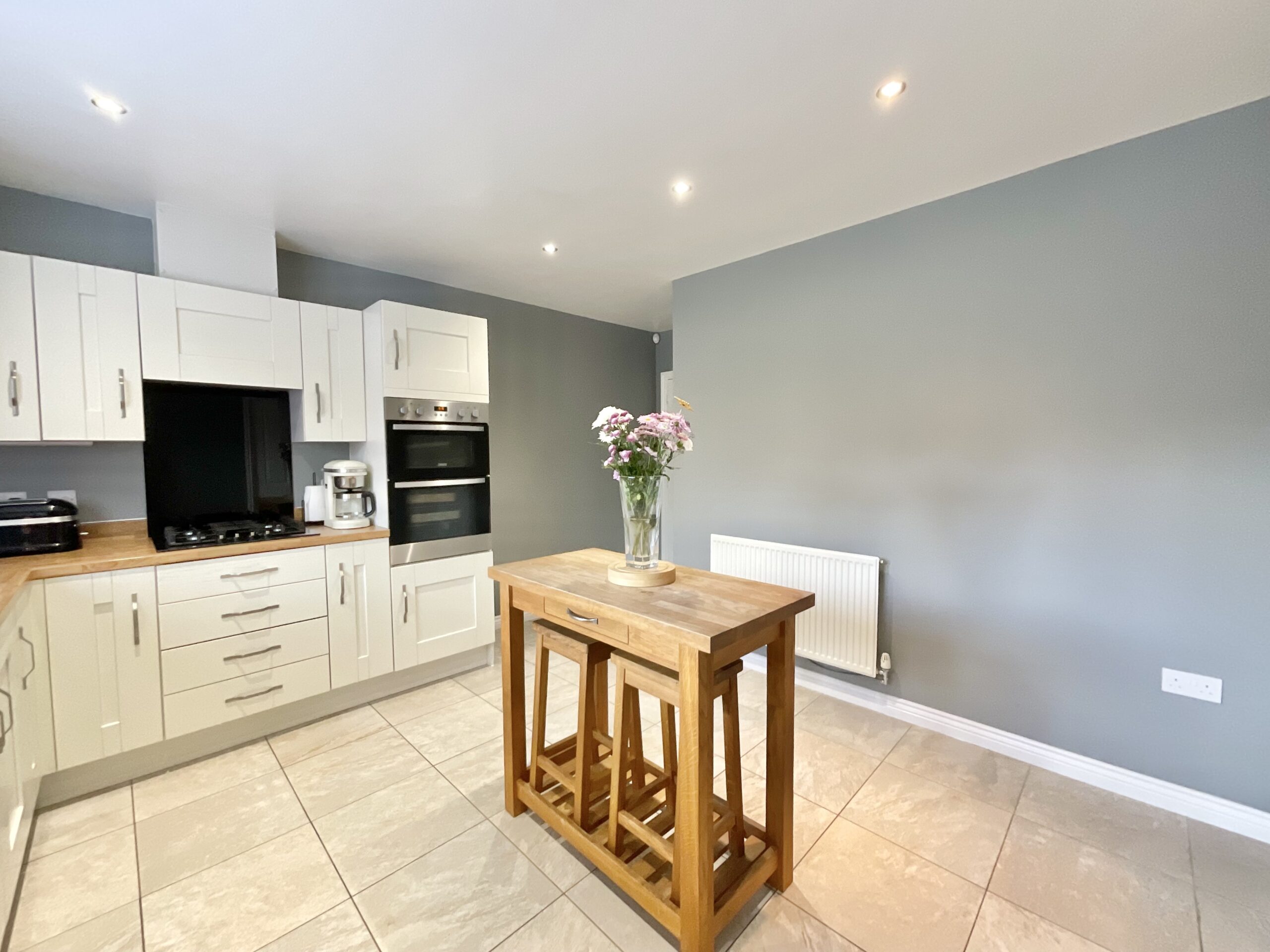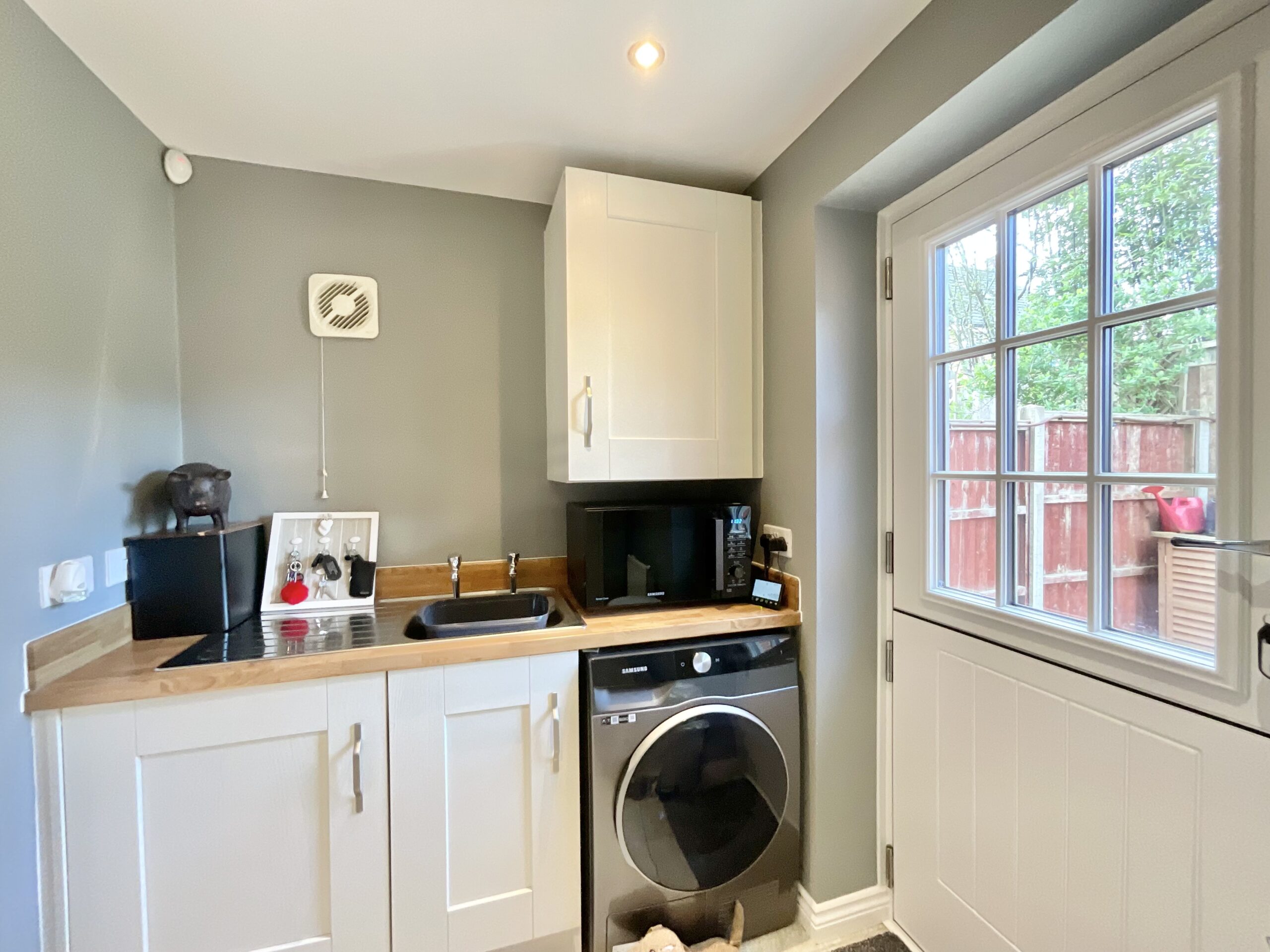 2. Stylish L-shaped kitchen with shaker cabinetry, integrated appliances, and breakfast space, plus utility room with garden access and convenient downstairs W/C.