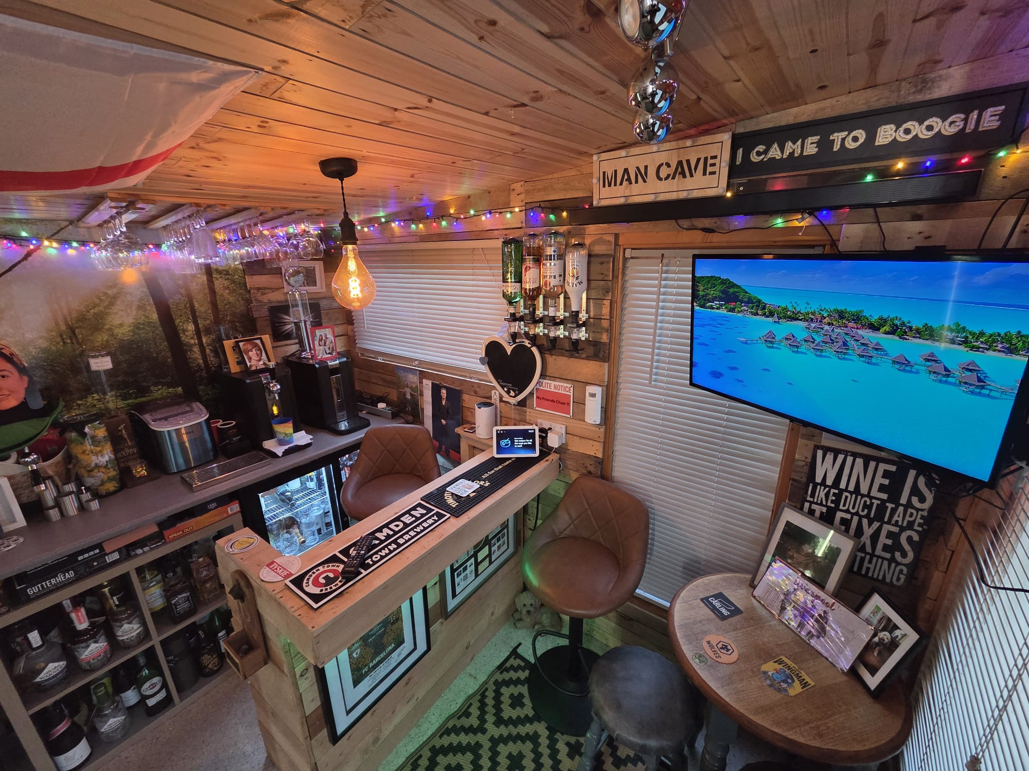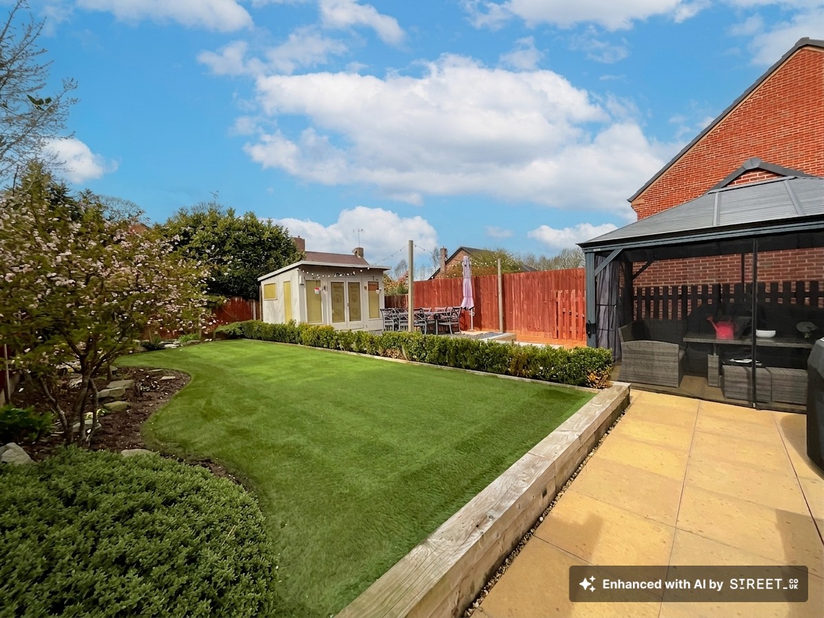 4. Beautiful West-facing landscaped garden featuring patio, slate seating areas, artificial lawn, mature planting, a waterfall, beautiful lighting and a fully fitted outdoor bar ideal for entertaining.