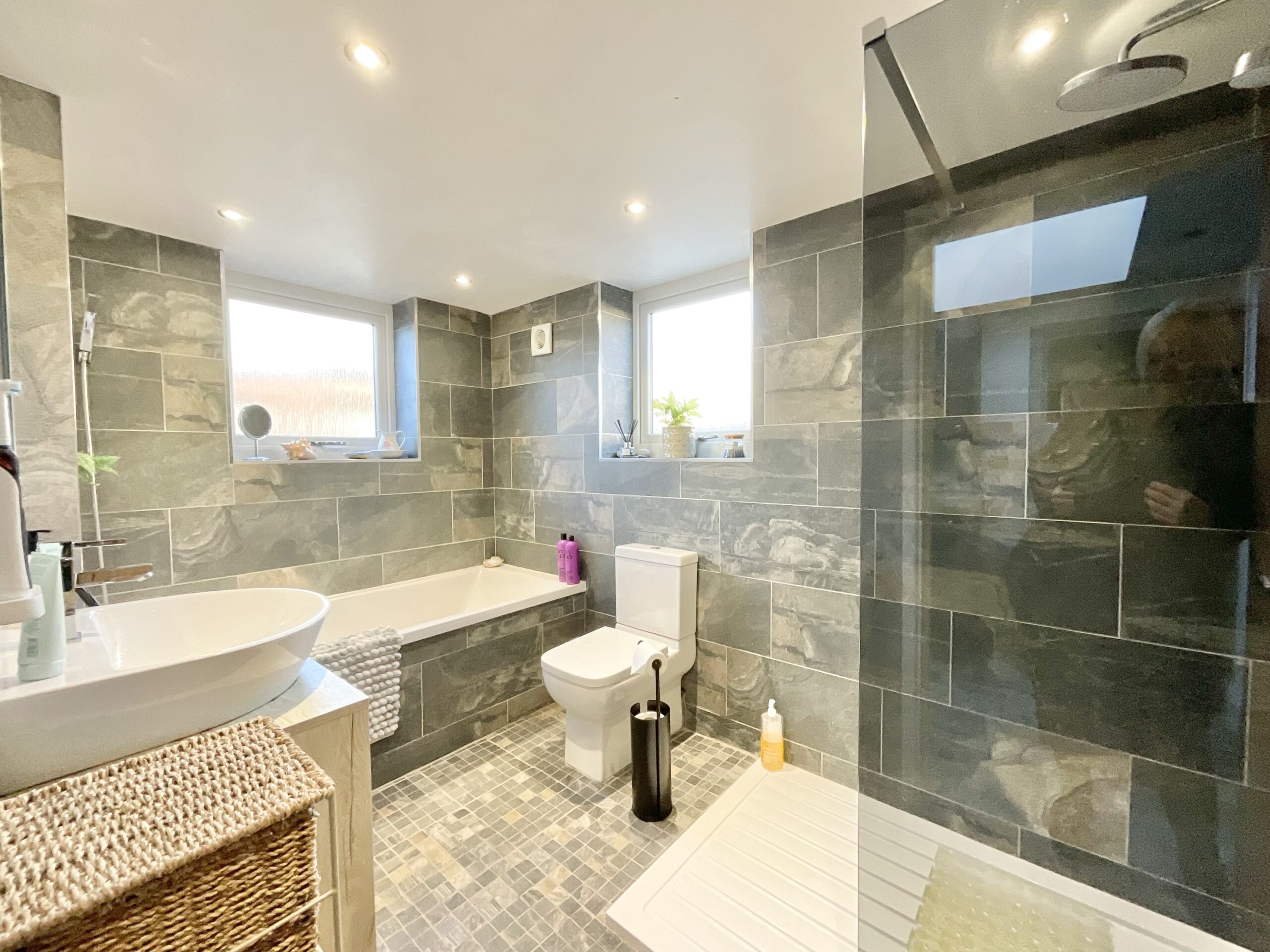 The well-appointed family bathroom comprises a bath with handheld shower, separate walk-in shower, WC, and wash basin set within a stylish vanity unit.