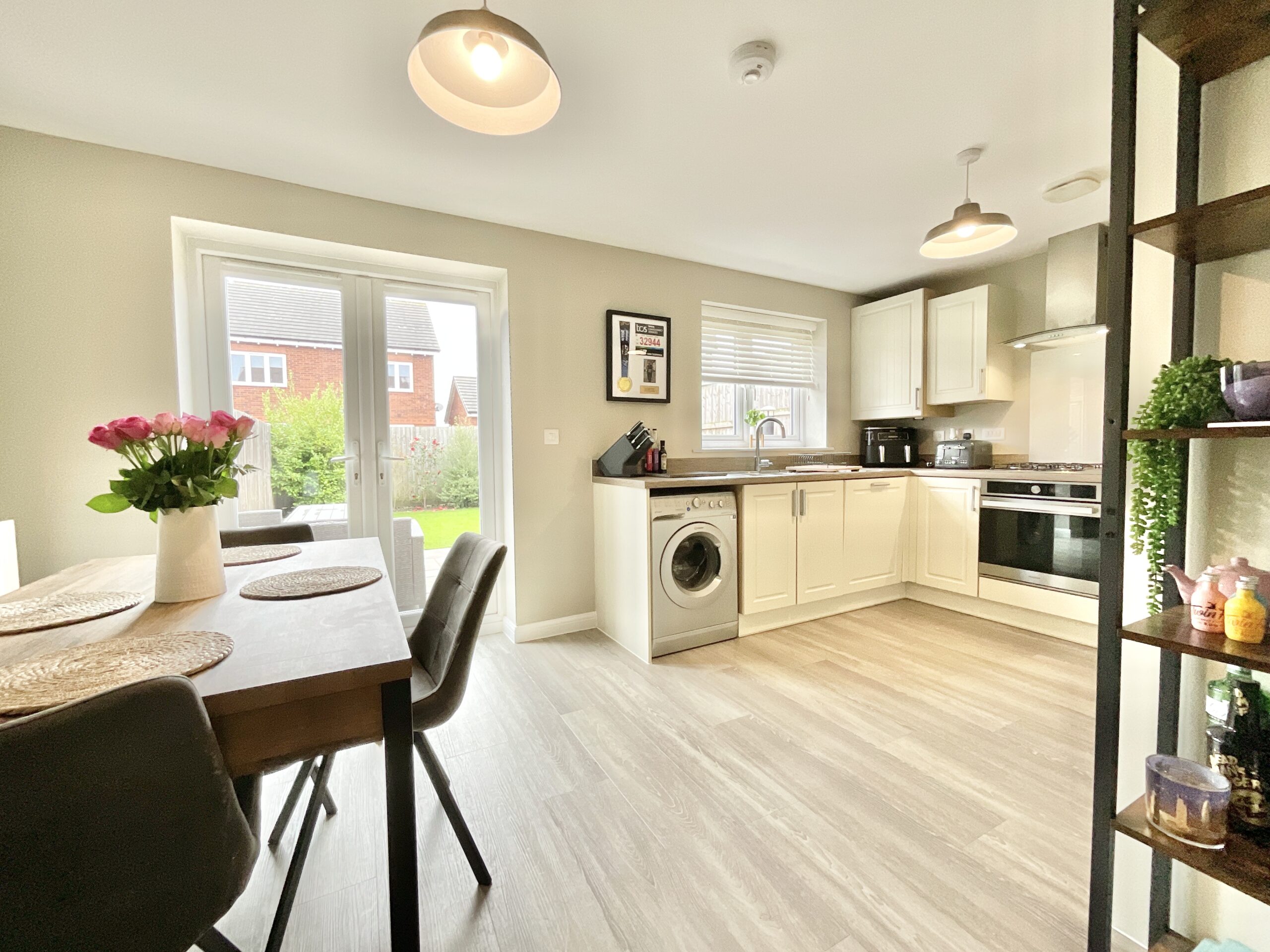 Push open the front door and hall-o there! You’re welcomed by a bright entrance hall that sets the tone for the rest of the home. With stylish wood-effect flooring underfoot, you’ve got easy access to the cosy living room and stairs to the first floor. The living room is light, bright and just right, featuring 16 month old grey carpeting and a front-facing window that really lets the sunshine do its thing. It’s the perfect spot to kick back, relax and soak up the glow. Flowing through (because this house is all about that easy-breezy lifestyle), you’ll find the open-plan kitchen diner. Here, cream cabinets and complimentary worktops blend beautifully with a range of integrated appliances, whisking up both style and function. There’s also a handy WC and storage area. French doors open straight onto the garden, making indoor-outdoor living an absolute delight.
