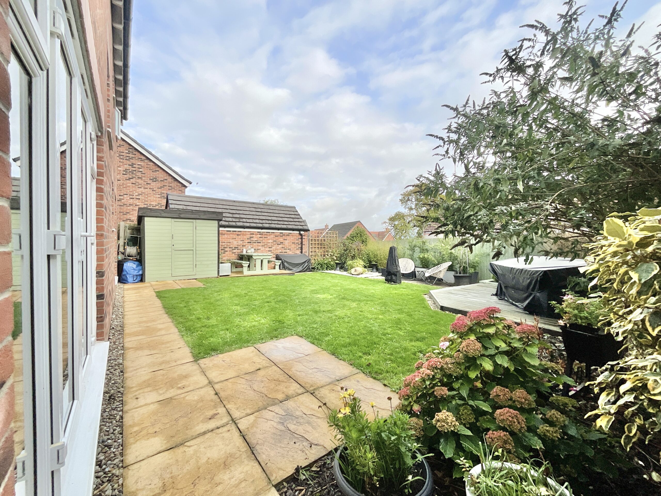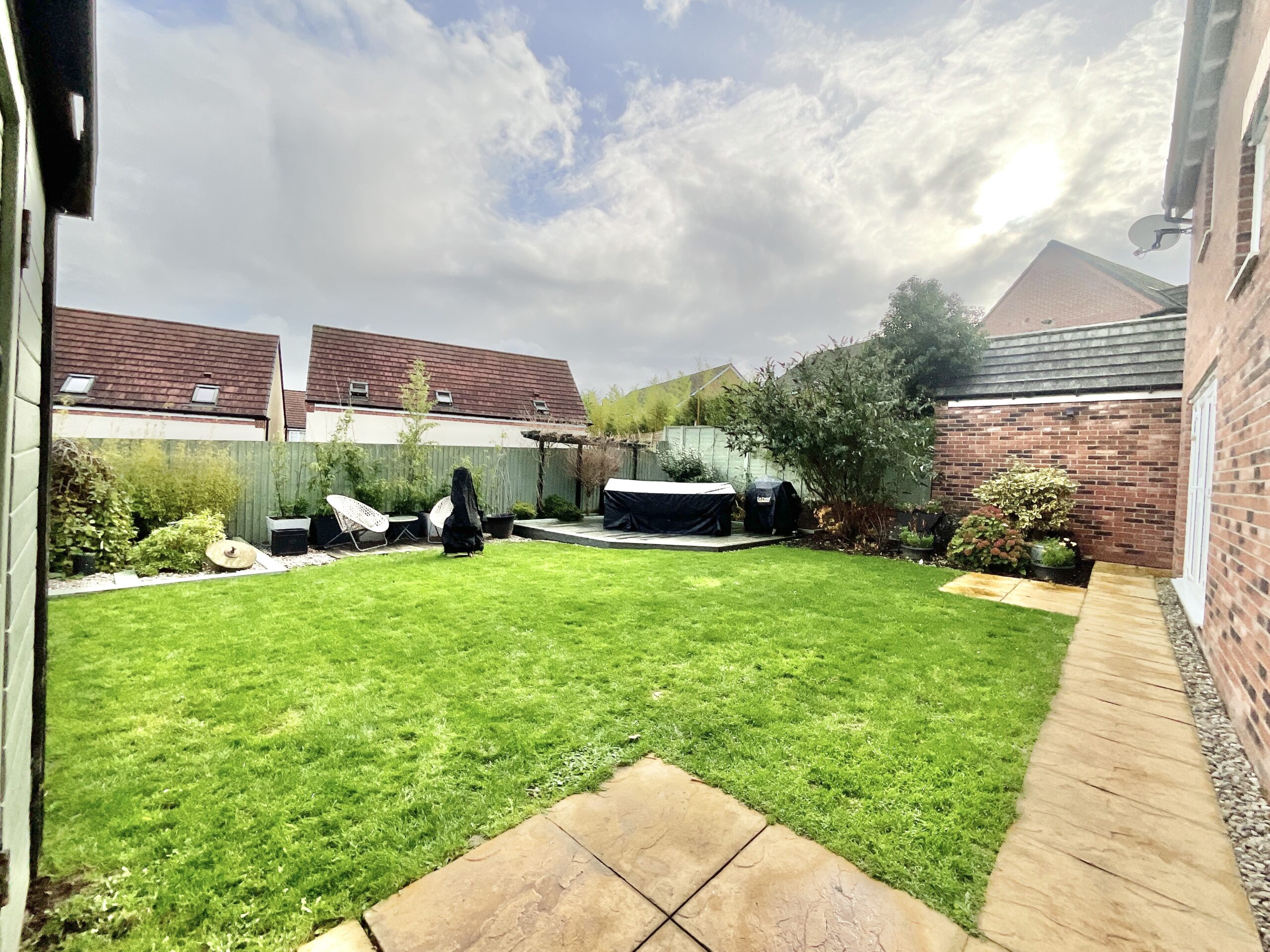 The large double fronted facade offers a delightfully grand feel to the property and on the right-hand side is a double width driveway meaning both cars can pull on and off the driveway freely which we think is a real treat as many have tandem driveways. There's a single garage and side access gate with a path down to the rear garden which has been thoughtfully landscaped providing different spaces for you to enjoy which include, a patio area, separate decking area and planted border on the right. Not only is the garden a delight to use but you will also enjoy a private rear aspect which again is not common on new build estates.