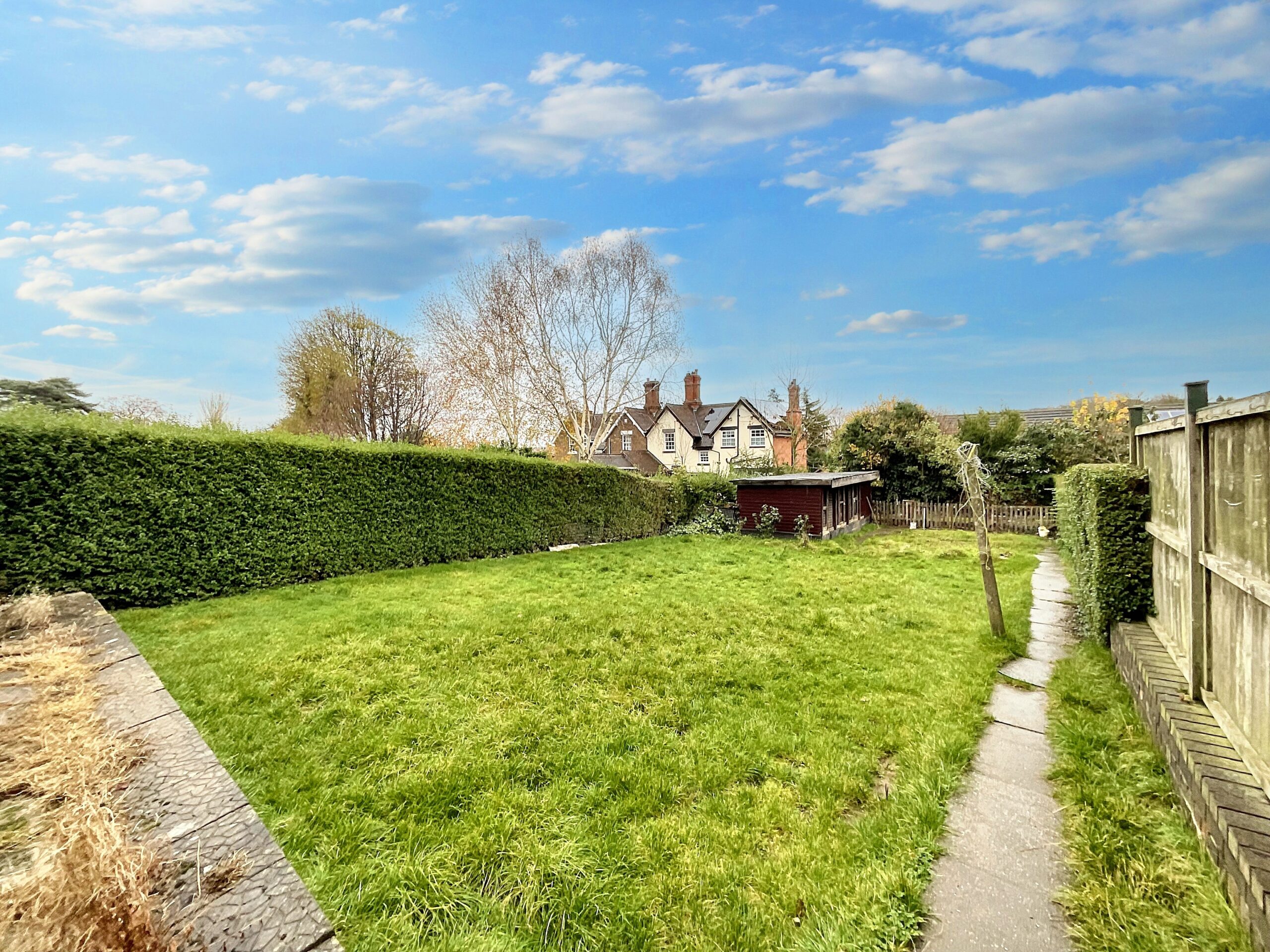 Continue to the rear garden where you’ll find an expansive East-facing rear garden with patio seating space, a lush grass lawn expanding to the rear, and mature hedges. Convenient side access leads you to the front of the home where iron gates provide access to the driveway with off-road parking.
