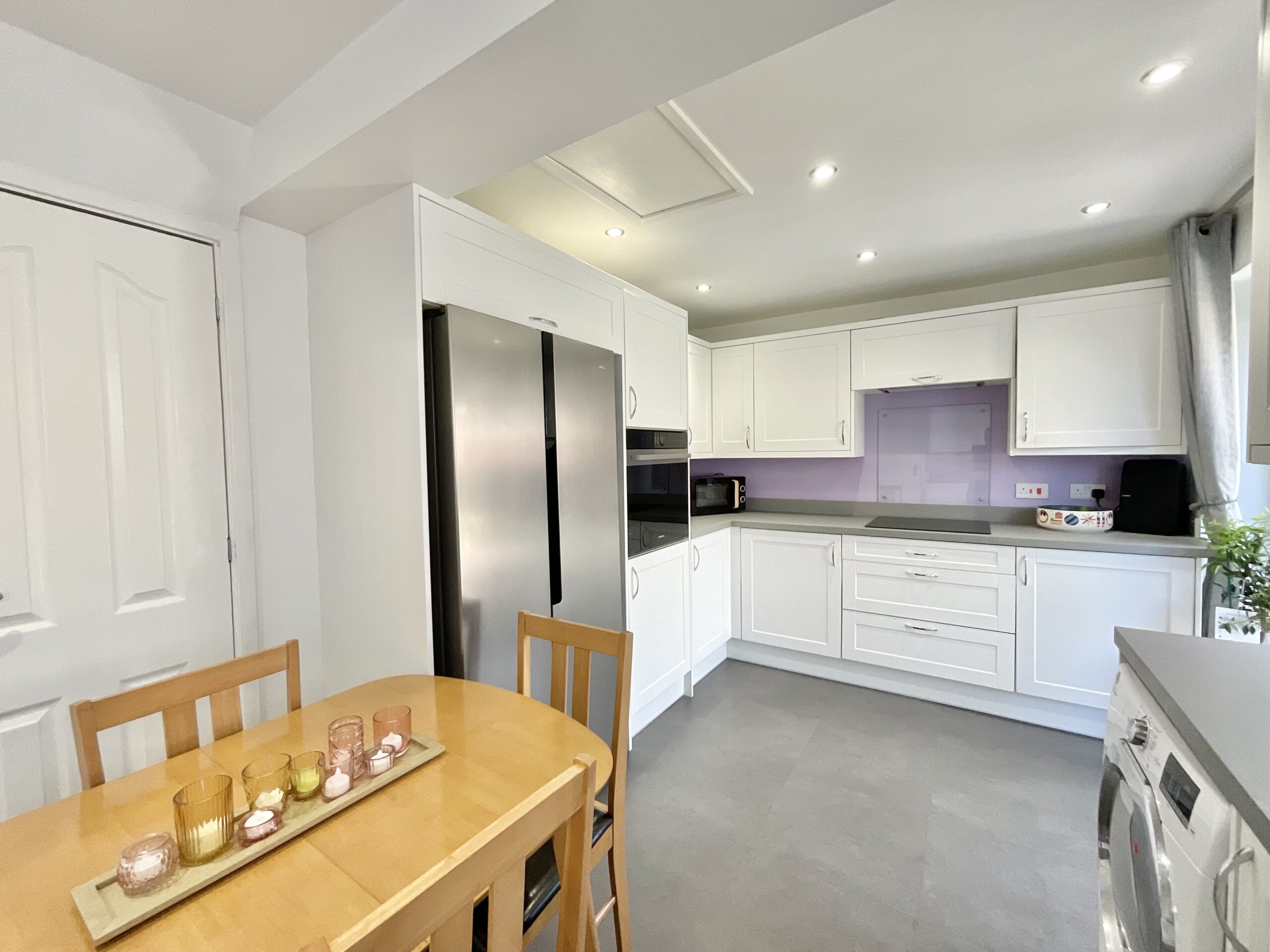 - Spacious kitchen/diner with shaker-style units, ample appliance space, and French doors opening onto the garden. Bright living room featuring a bay window, cosy fire surround, and French doors.