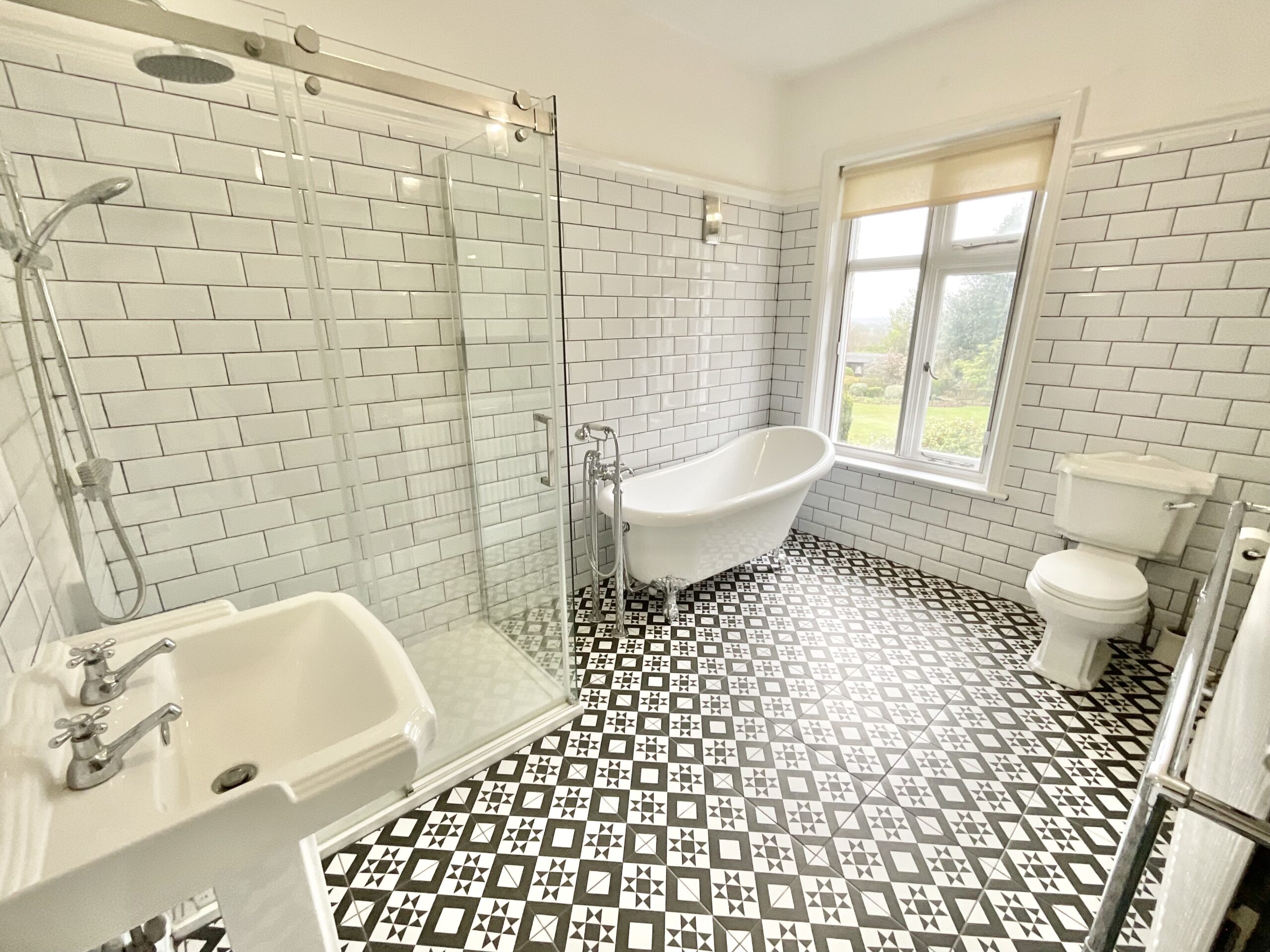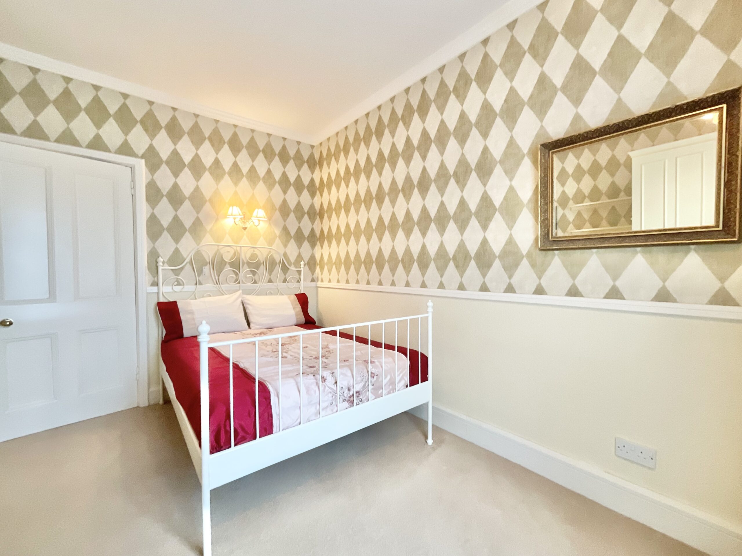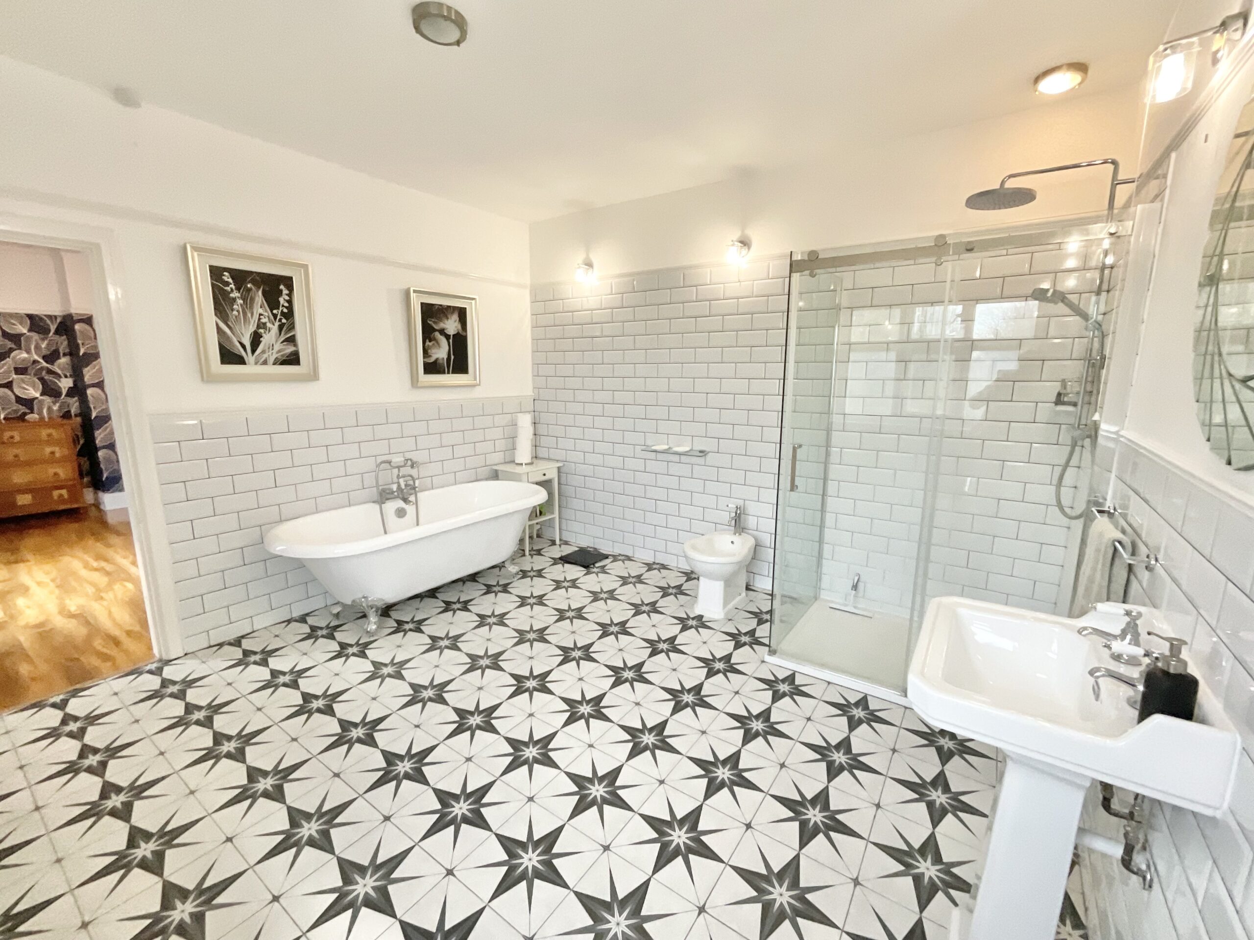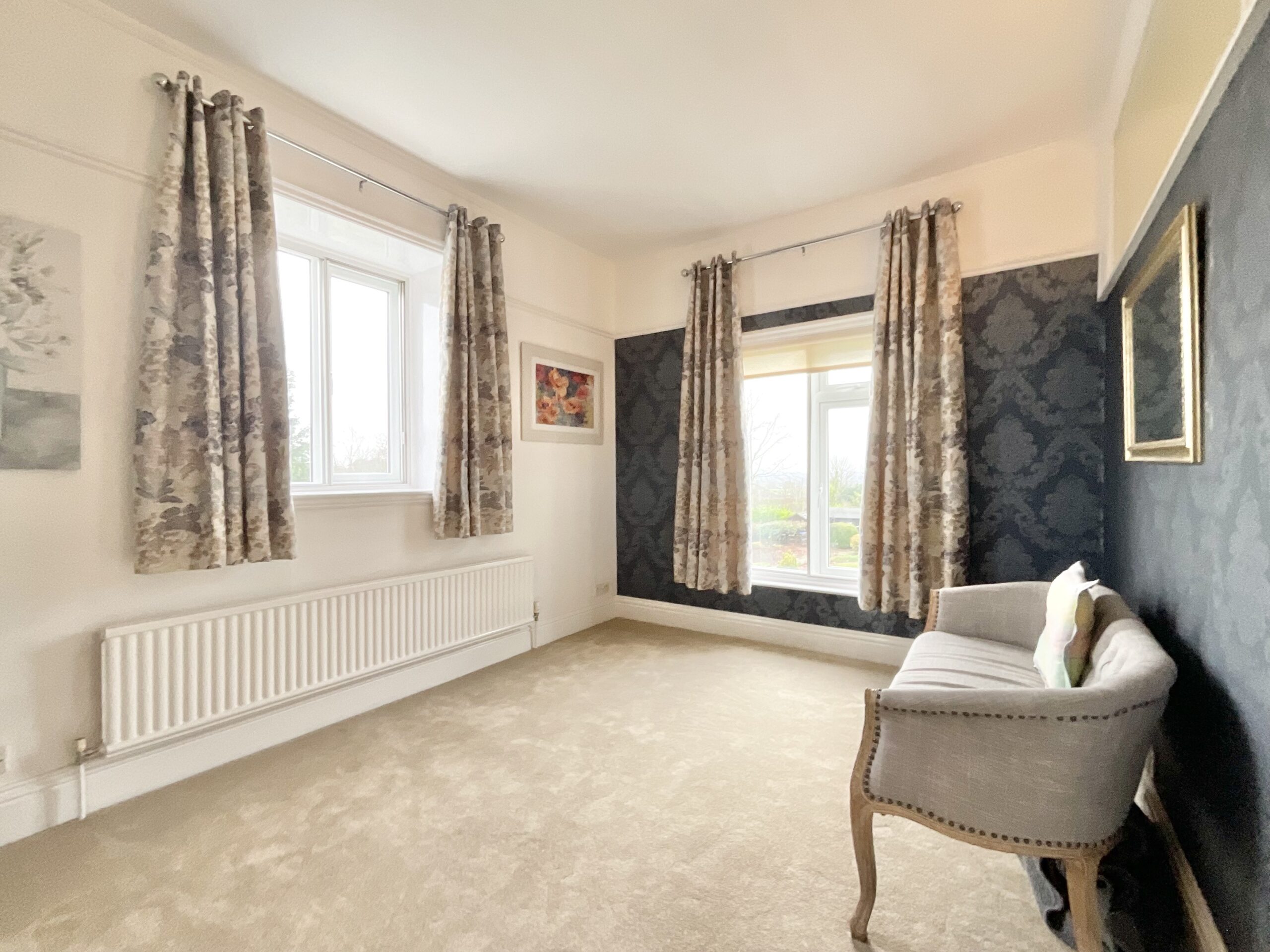 Upstairs, five beautifully proportioned bedrooms provide generous and flexible accommodation. The master bedroom is particularly impressive, served by a luxurious en-suite with a freestanding bath, bidet, separate mains-fed shower, WC and wash basin. Bedroom two enjoys its own private dressing room or sitting room, adding further versatility. The remaining bedrooms are all spacious, inviting and filled with natural light, two of which feature fitted wardrobes. The family bathroom is equally well-appointed, featuring a slipper bath, mains-fed shower, WC, wash basin and built-in shelving. A further dressing room is located off the landing, providing valuable additional storage.