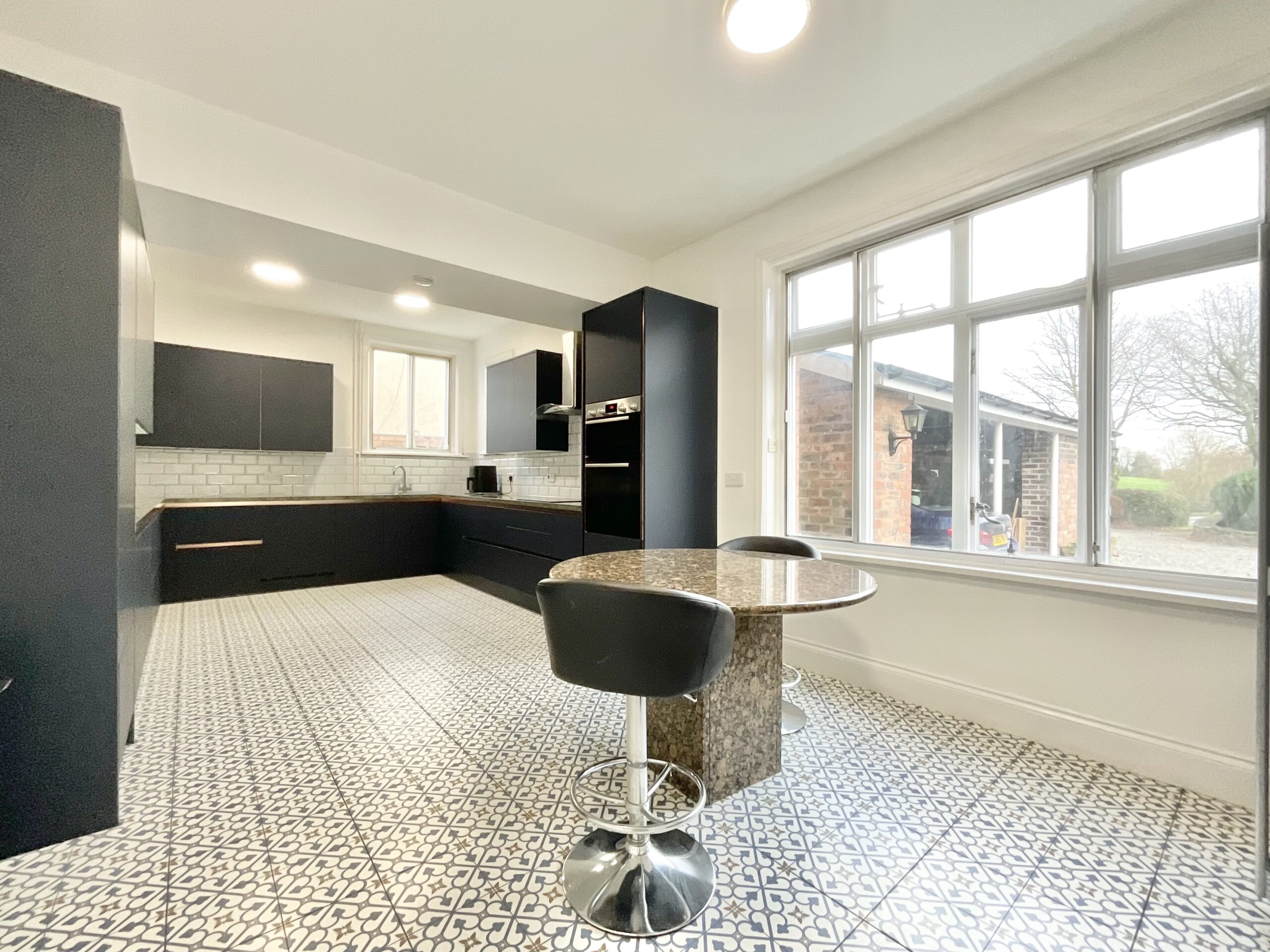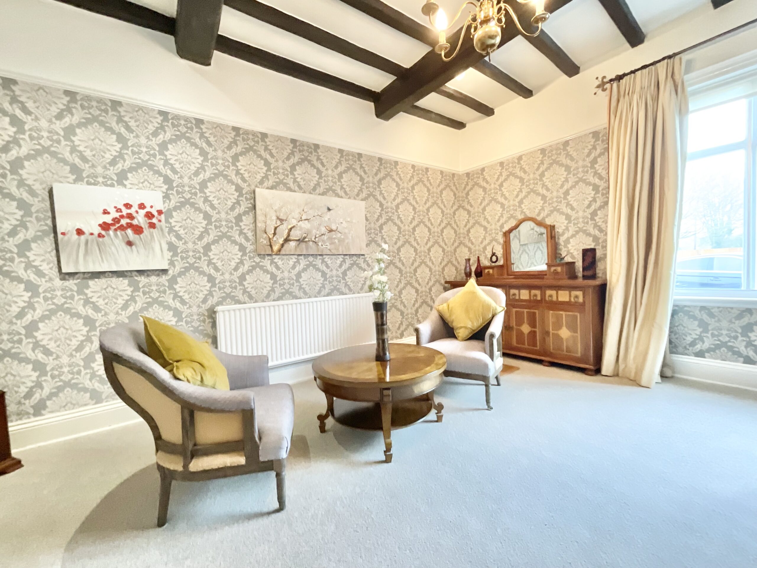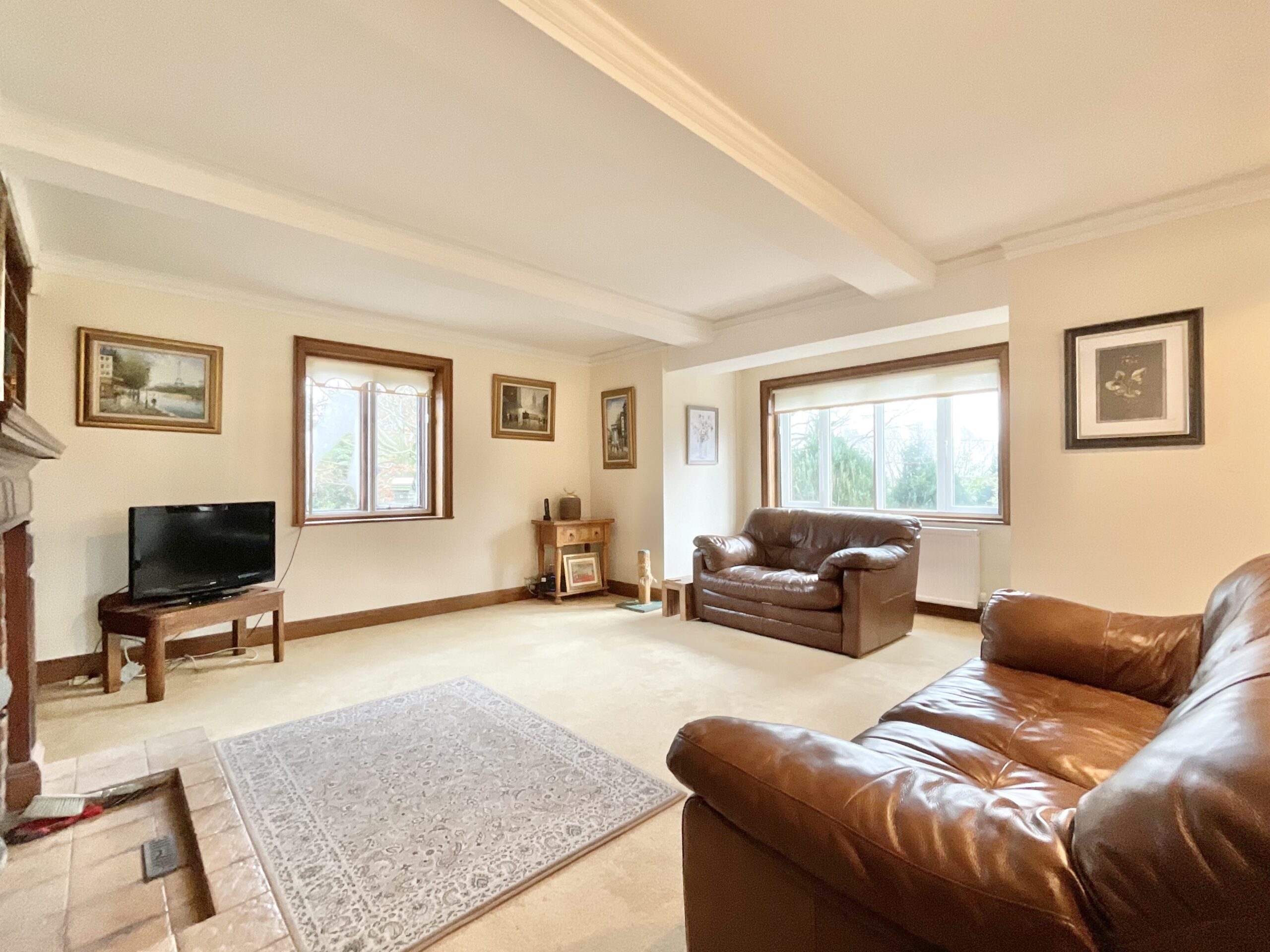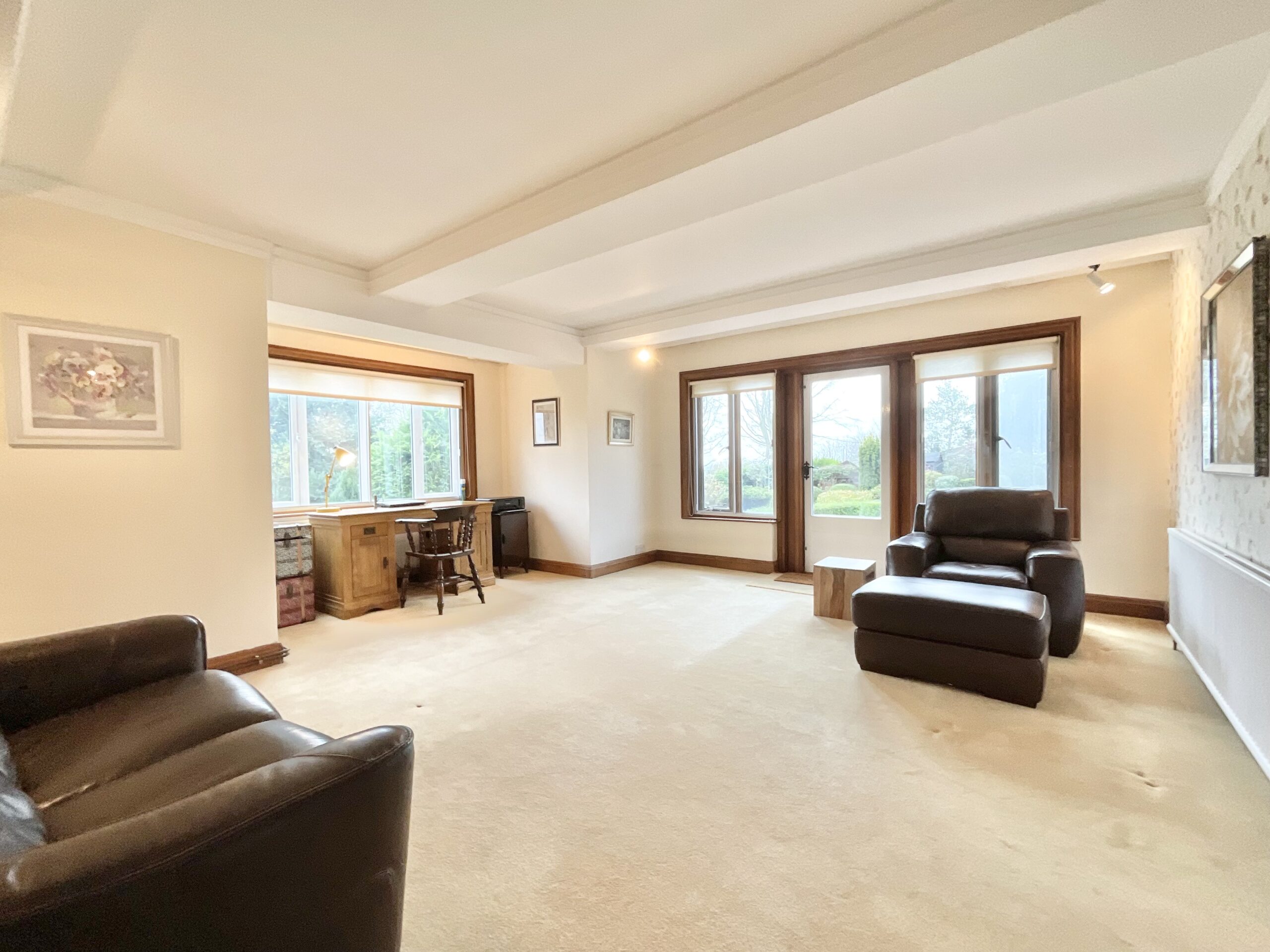 The sitting room is a serene and picturesque retreat, filled with natural light and enriched by original beams and picture rails. With its open fireplace and delightful views over the landscaped gardens, it offers a tranquil setting for relaxation. The expansive lounge provides exceptional versatility, arranged into two distinct areas: a snug, firelit corner perfect for reading or unwinding, and a bright, airy section overlooking the gardens. With four generous windows and built-in bookcases flanking the fireplace, the room exudes both comfort and elegance.