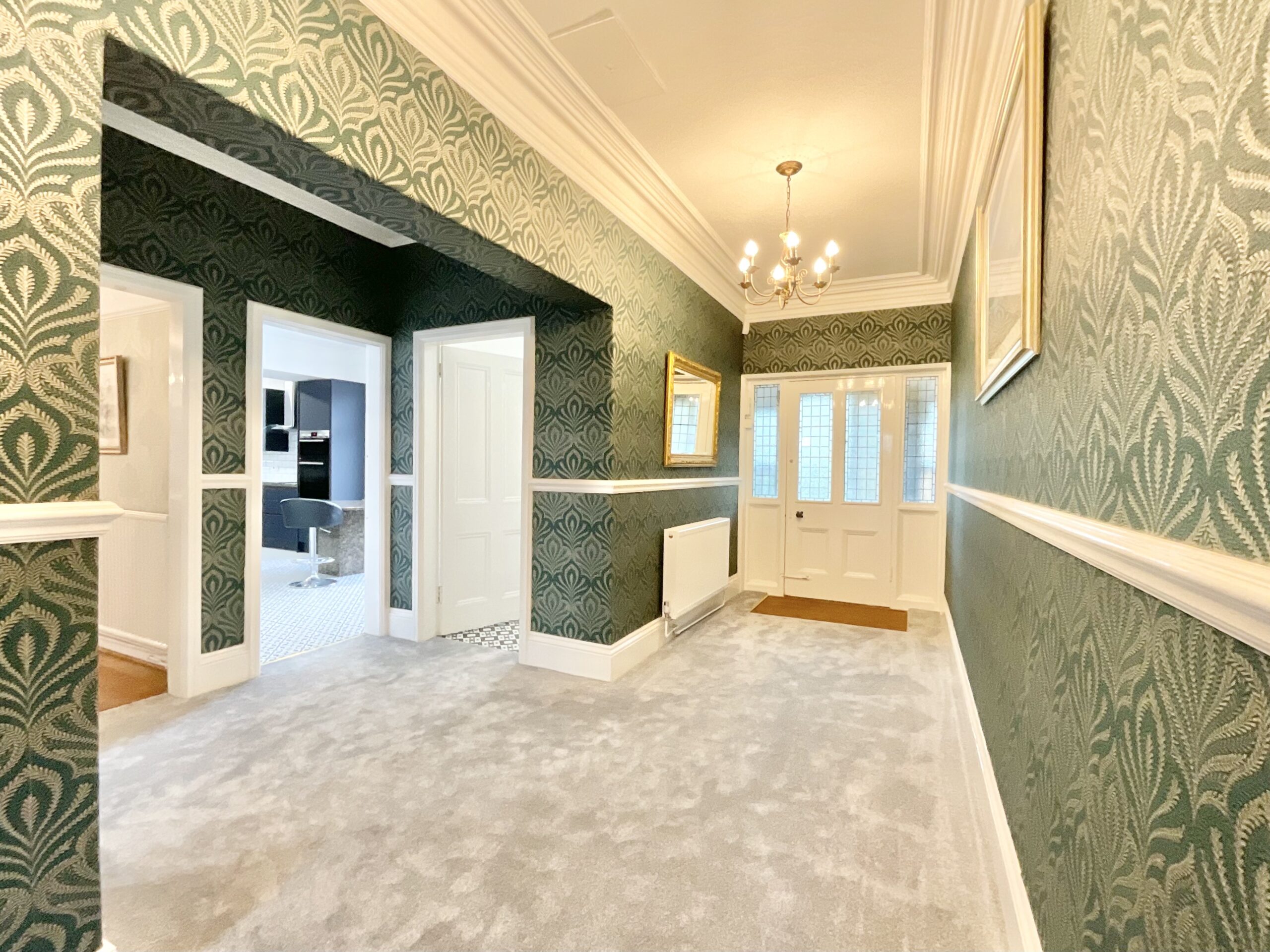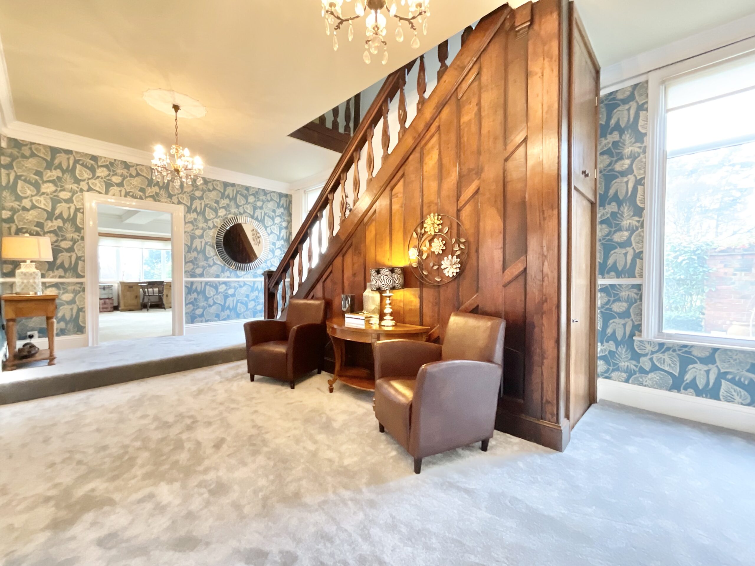 The imposing inner hall is a magnificent central feature of the home. Its scale, elegance and original detailing are beautifully highlighted by the striking mahogany staircase, a true architectural statement that enhances the home’s grandeur and presence.