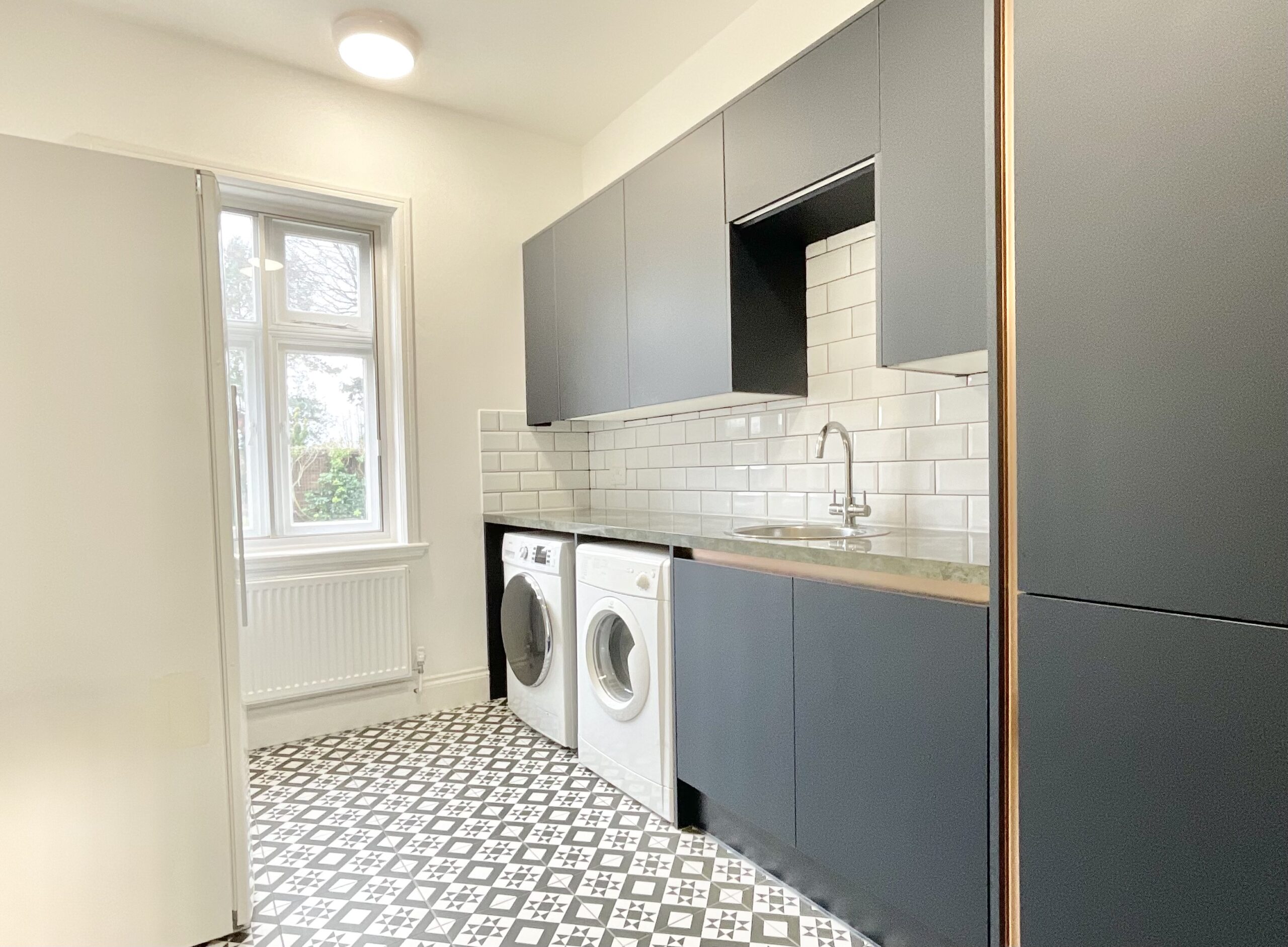 - Luxurious modern upgrades, including a contemporary deep-blue kitchen with premium Bosch appliances and a stylish utility room.