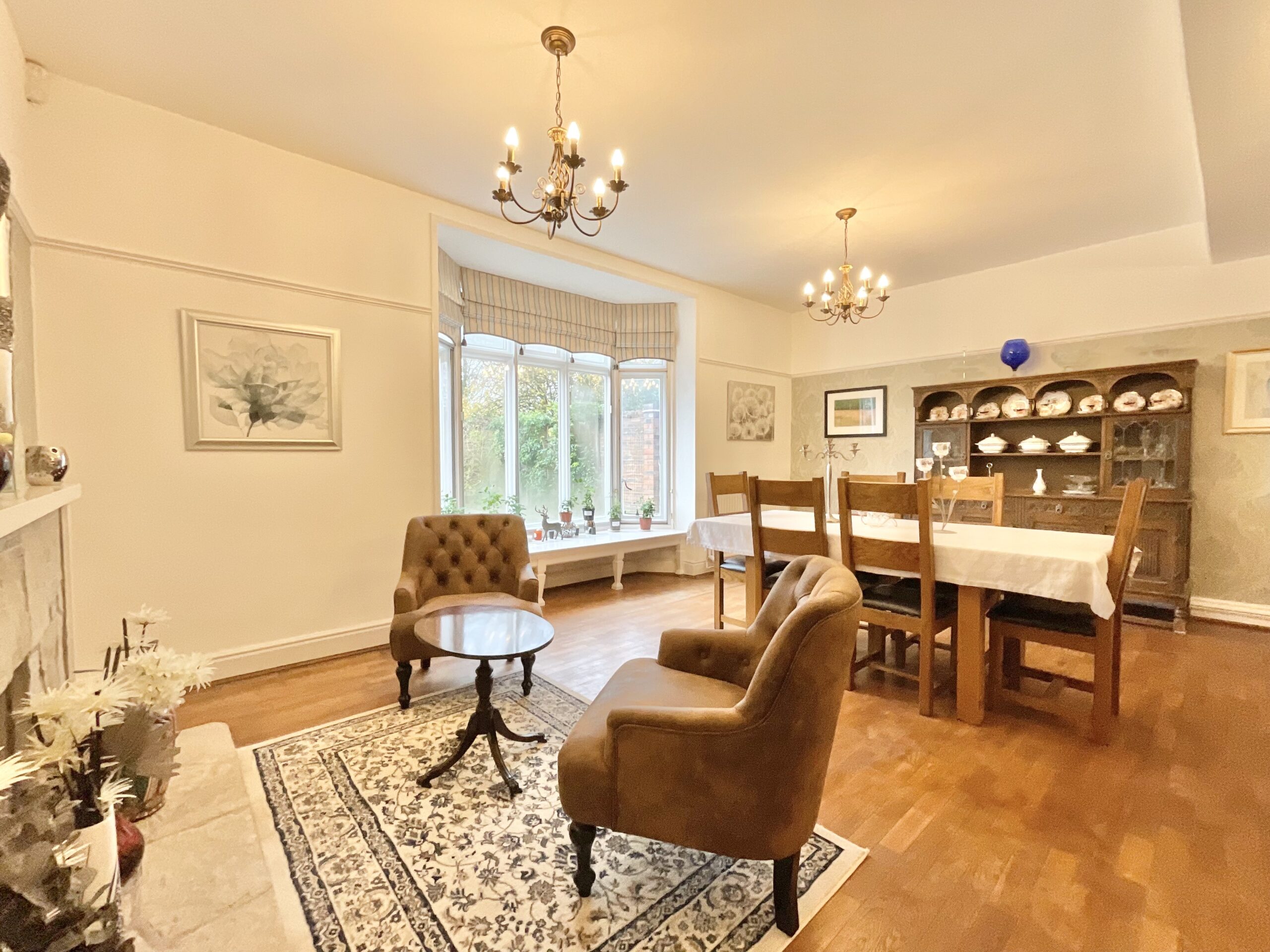 The dining room is a wonderfully atmospheric and versatile space. Rich parquet flooring, picture rails and a handsome fireplace create a warm, inviting environment. A cosy seating area in front of the fire provides the perfect spot for relaxed evenings, while the generous proportions comfortably accommodate a large dining table, making the room ideal for both informal family meals and more formal entertaining.