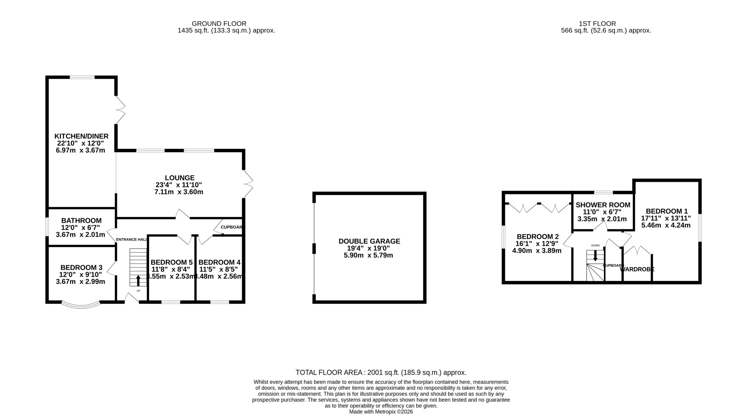 The property offers five generous double bedrooms, providing flexible accommodation for families or those requiring home office space. Two bedrooms are located on the first floor, including the main bedroom which benefits from built-in clothing storage, while bedroom two also features fitted storage.