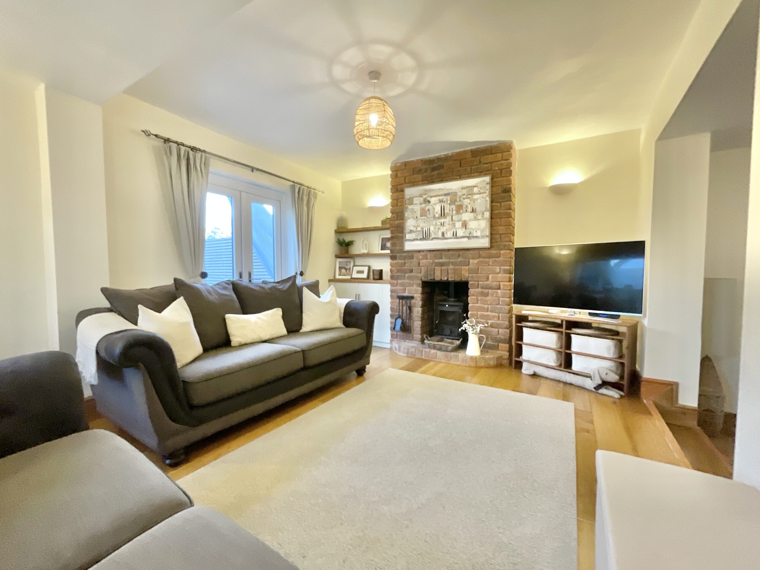 Step through the front door and into a welcoming porch, complete with a handy cloakroom. From here, you’ll glide into the beautifully appointed kitchen, featuring stylish cabinetry, a sociable island and integrated appliances, perfect for whipping up something supercalifragilisticexpialidocious. A central hall separates the kitchen from the open living and dining area, showcasing original tiled flooring and stairs rising to the first floor. The open-plan living/dining space is the heart of the home, ideal for entertaining or unwinding after a long day. A cosy log burner adds warmth and charm, while French doors open out to the garden, blending indoor comfort with outdoor delight. Quite frankly… there’s no place I’d rather be.