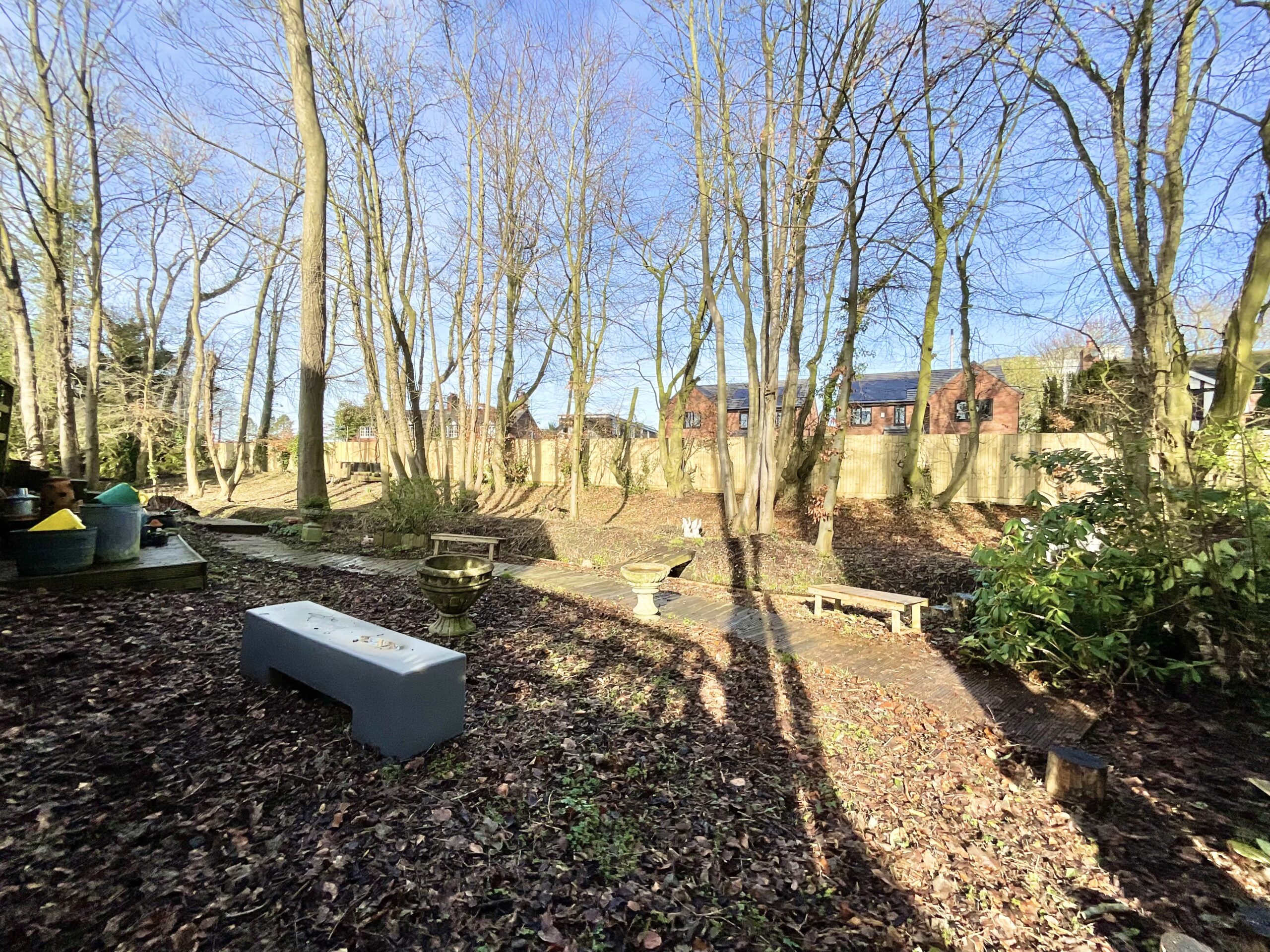 To the rear, the property enjoys a wonderfully private woodland garden with a stream running through, creating a peaceful and picturesque backdrop. The Indian stone patio provides the perfect setting for outdoor dining and entertaining.