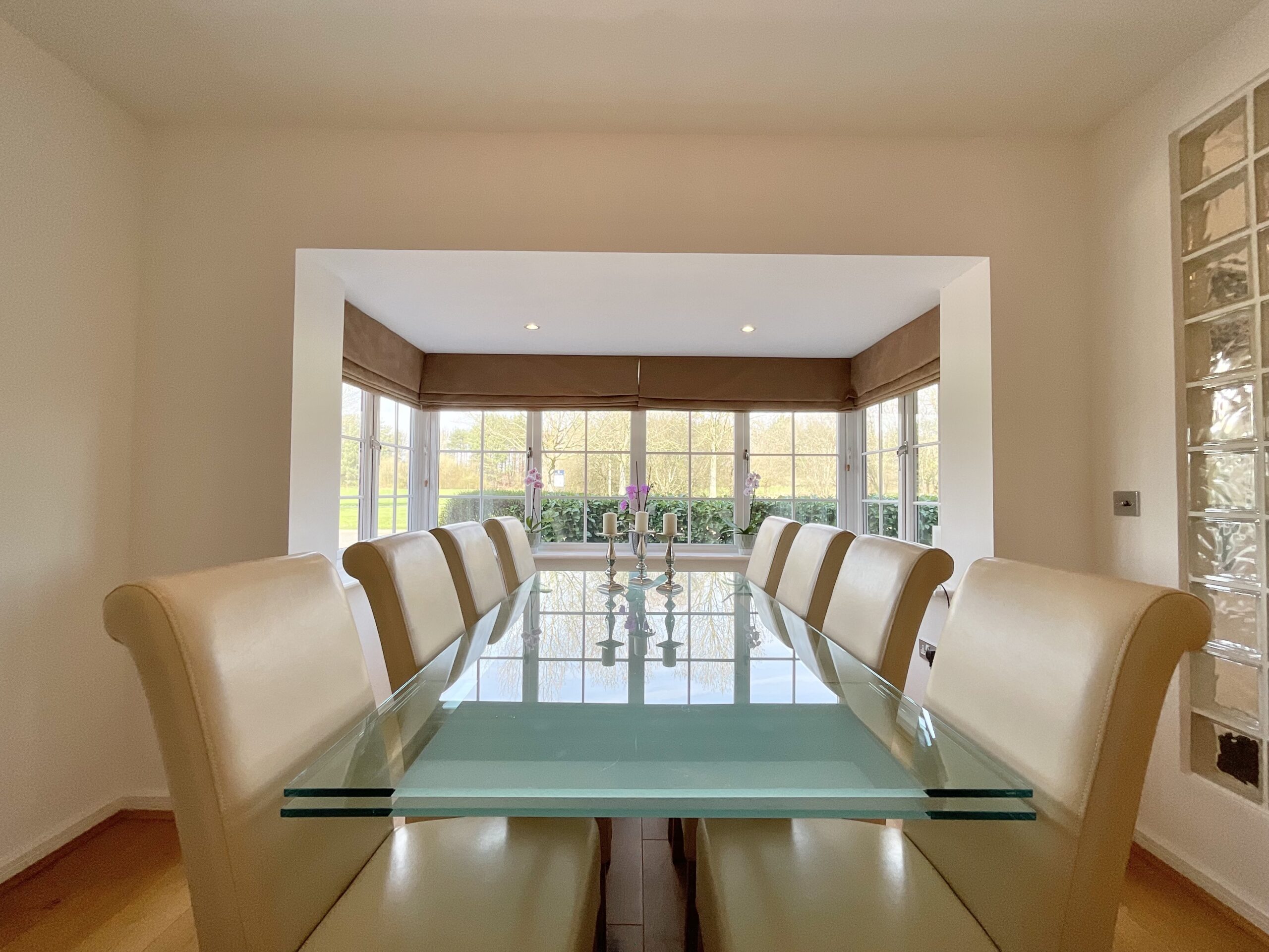 The formal dining room is equally impressive—perfectly proportioned for entertaining on a grand scale, with ample space for a large dining table and enhanced by a striking bay window that floods the room with natural light, creating a warm and inviting atmosphere for both family meals and special occasions.