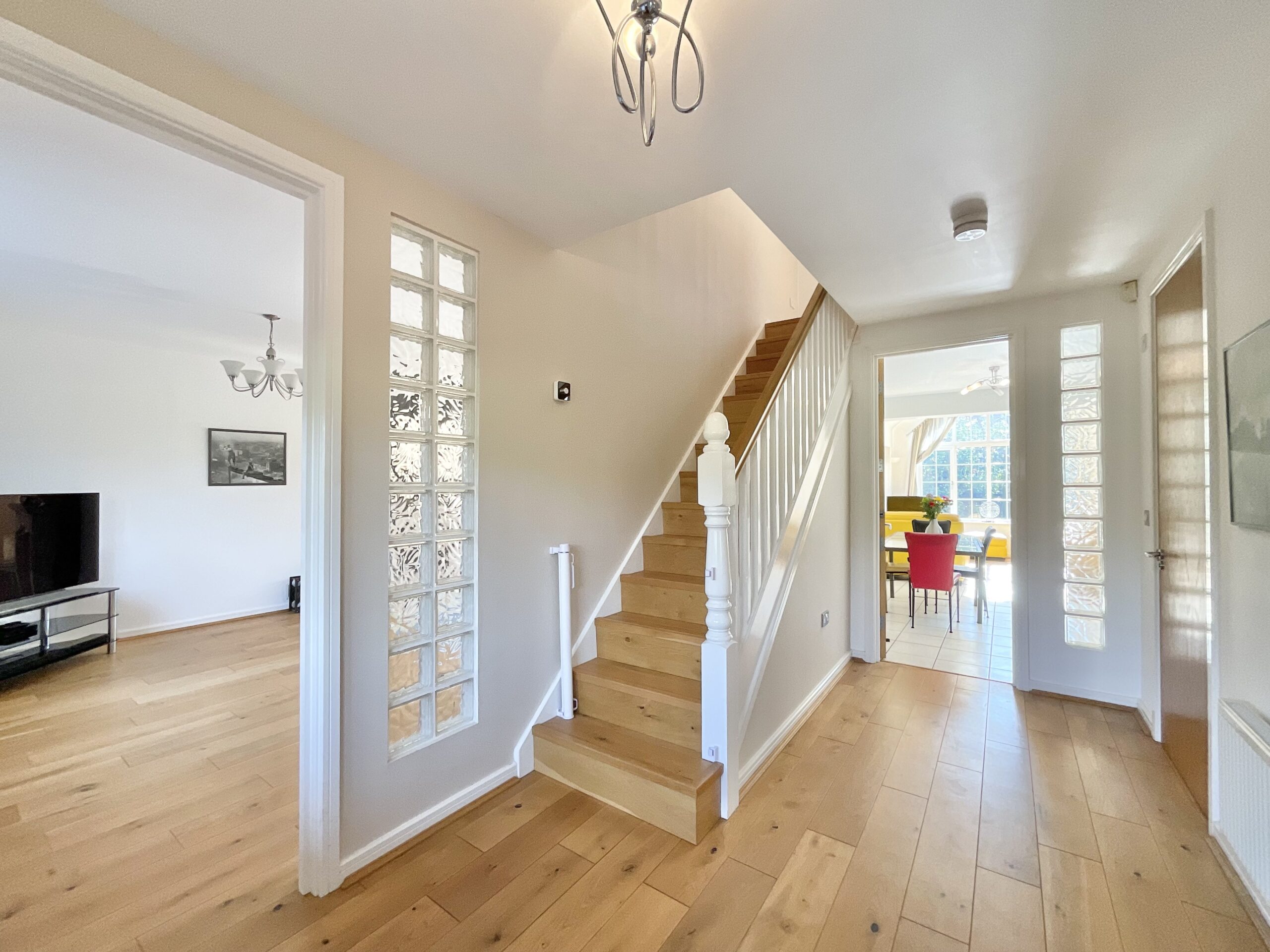 From the moment you step inside, the home impresses with its sense of space and natural light. The welcoming entrance hall leads through to a stunning dual-aspect living room, where large windows and elegant French doors invite the outdoors in, creating a wonderfully bright and relaxing space with direct access to the beautifully maintained rear garden.